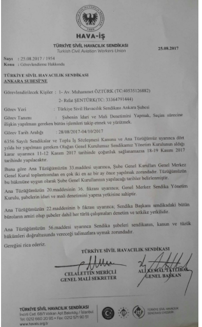 Hava İş sendikası genel merkezi yaklaşan delege seçimleri ve Genel Kurul için şimdiye kadar hiç yapılmayan bir uygulama yürütüyor. Her ne kadar  yasa ve sendika tüzüğü seçilmiş Şube yönetimlerini bu tarz denetime tuttuğu görülmemiş olsa da, Ana tüzüğün 22.maddesinin b fıkrasına atıfta bulunarak, sendika başkanının bütün büroların amiri olduğu ve çalışmaları denetleme yetkileri bulunduğunu iddia ederek Ankara delege çalışmalarını kendilerinin yapacağını ifade etmişler. Kısaca Ankara Şube’nin elindeki yetkileri üzerlerine almak istiyorlar.