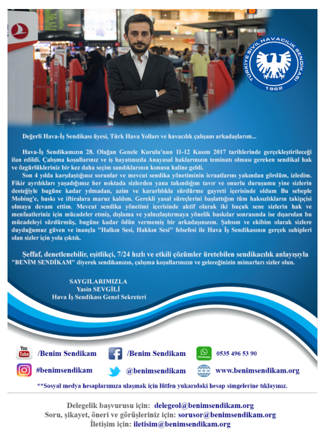 Hava İş delege seçimleri ve genel kurul yaklaştıkça hareket arttı. Ankara ve Anadolu şubelerinden sonra Hava-İş in genel sekreteri Yasin Sevgili de bildiri yayınlayarak bende varım dedi. İŞTE O BİLDİRİ…!